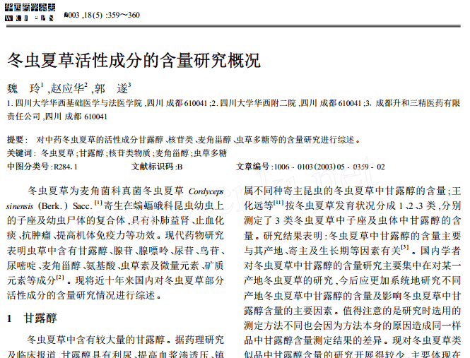 华西药学杂志:冬虫夏草活性成分的含量研究概况